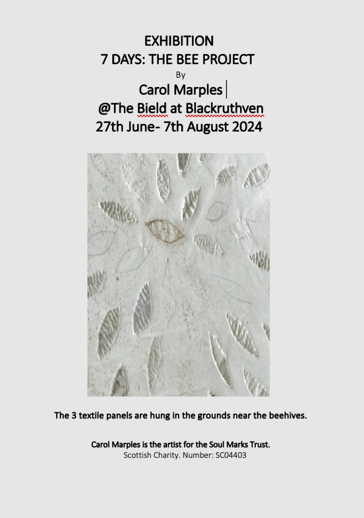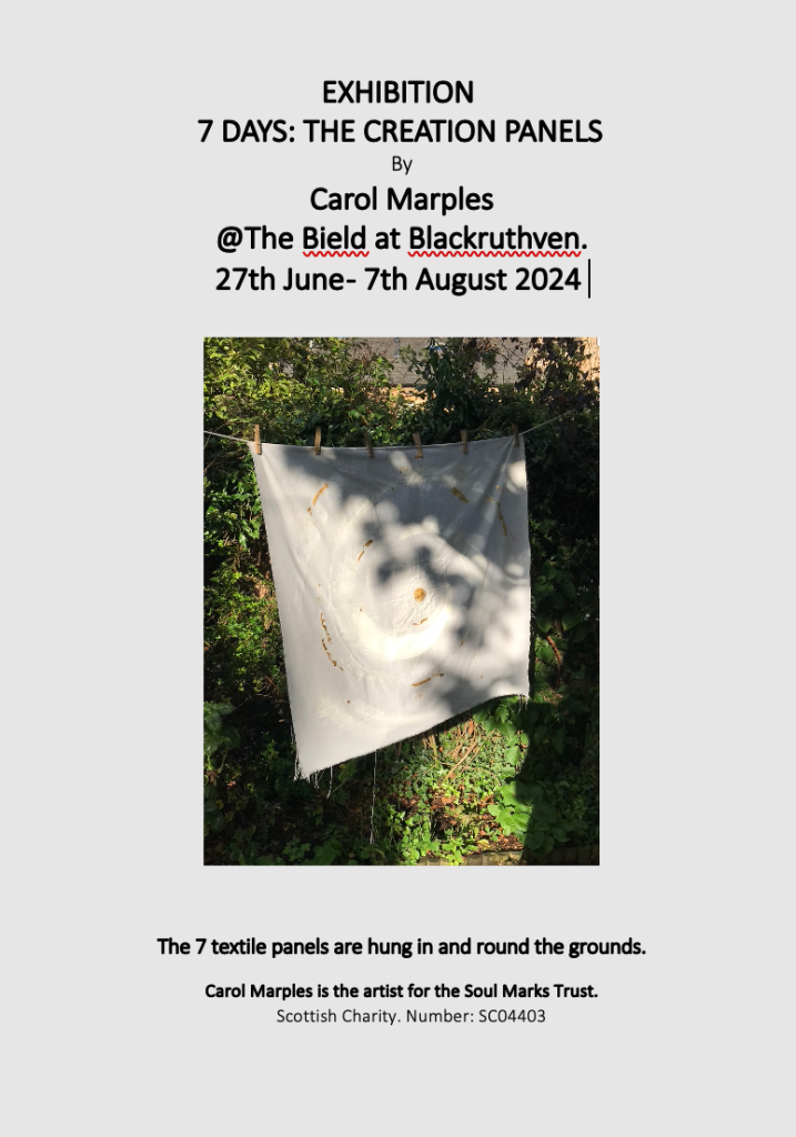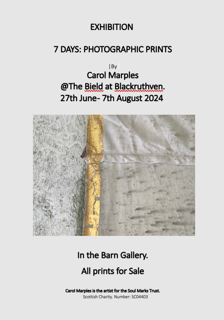 7 DAYS is currently being exhibited @ The Bield at Blackruthven, Perth. 27th June – 7th August 2024. Photos and documenting from the exhibition can be seen here: http://www.soulmarks.co.uk/7-days/7-days-july-oct-2012/7-days-the-bield/